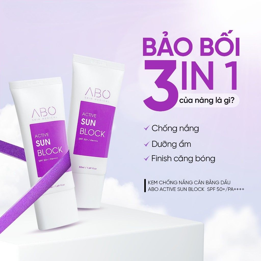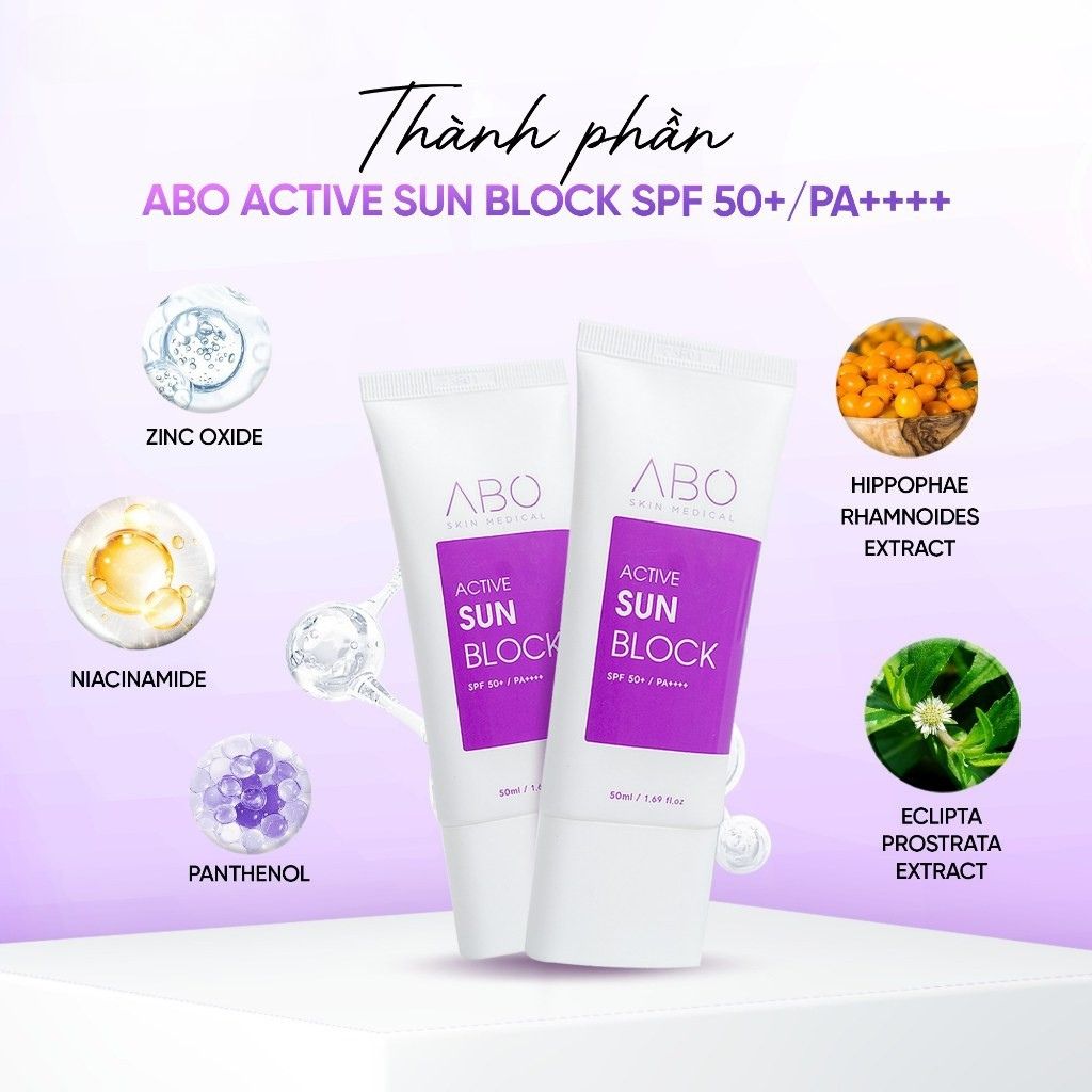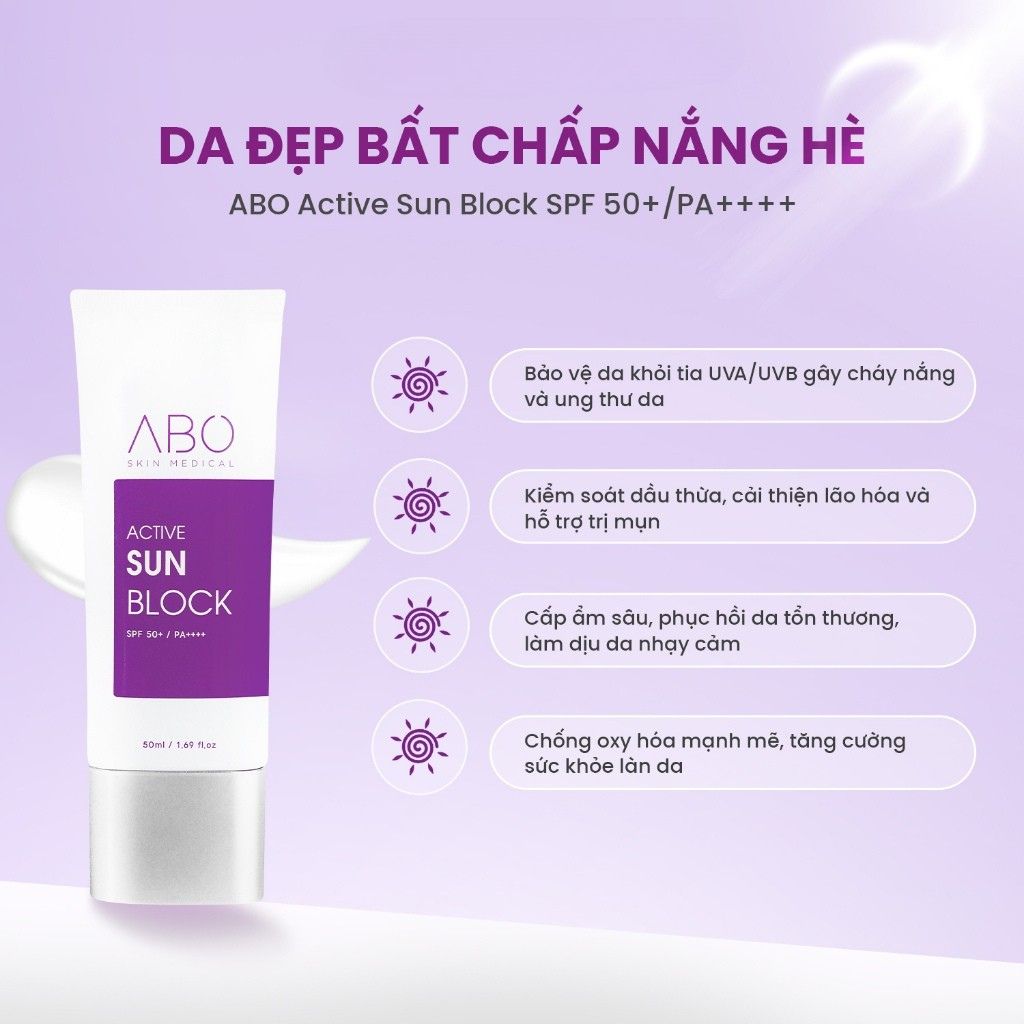 Kem chống nắng ABO Active Sun Block SPF50+ PA++++ là kem chống nắng phổ rộng nâng cấp với màng lọc vật lý Zinc Oxide kết hợp tinh chất dưỡng da.