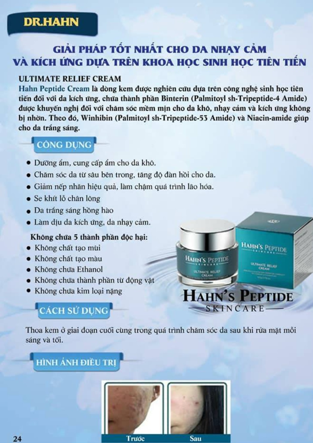 Rửa mặt → toner → serum → thoa kem Hahn’s Peptide Ultimate Relief.