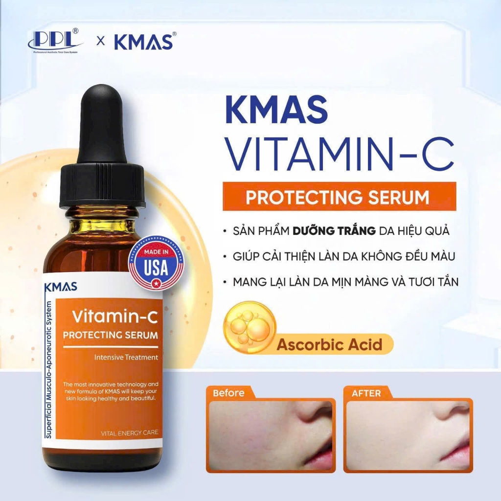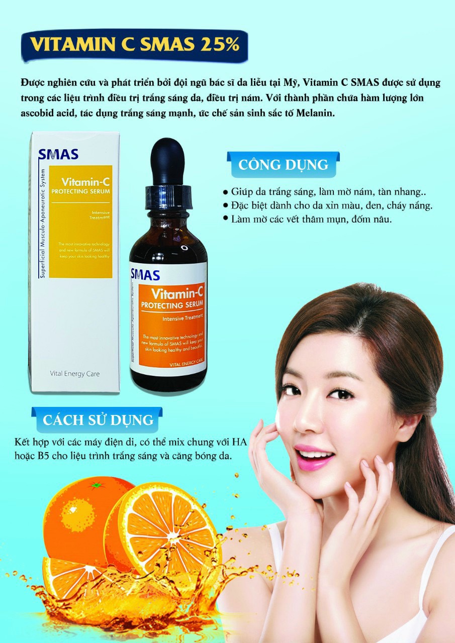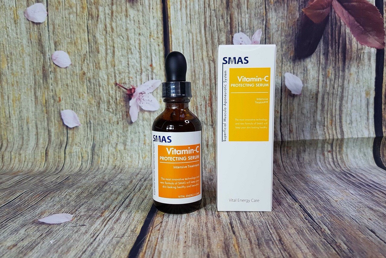 Serum Vitamin C SMAS Protecting Serum là sản phẩm chăm sóc da cao cấp đến từ Mỹ (USA), chứa hàm lượng Vitamin C tinh khiết 20–25% kết hợp Vitamin E và Acid Ferulic giúp mờ thâm mụn, giảm nám, làm sáng và đều màu da.